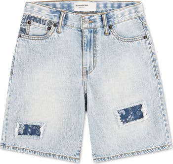 Fun fray-trimmed patches add texture and charm to these nonstretch denim shorts.