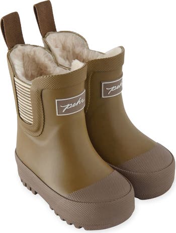 This durable rubber boot lined in plush faux shearling is waterproof, lightweight and flexible, perfect for chilly days and rainy play.