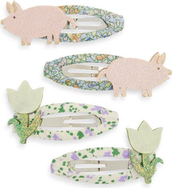 Sweet, sparkly and oh-so-cute, these mini hair clips brighten any 'do with glittery pigs and tulips.