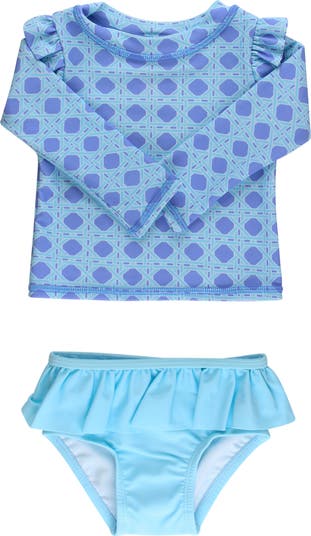 Long sleeves and built-in UPF 50+ keep their skin protected from the sun, sand and surf as they splash and play in this two-piece swimsuit with fluttery ruffles.