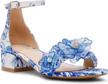 A vibrant floral pattern and jewel-embellished appliqués enhance the photo-worthy charm of a kid-sized sandal set on a low block heel and fastened with an adjustable buckle closure.