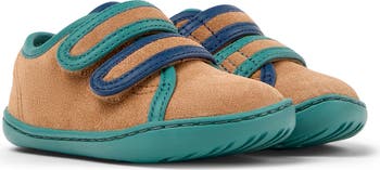 The label's signature complementary but not identical design patterns this easy-on leather sneaker complete with adjustable straps for a kid-friendly fit.