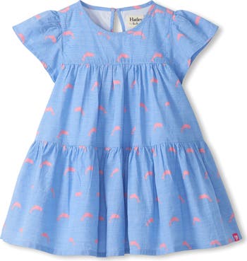 Pretty pink dolphins make a splash on this tiered dress cut from soft, breathable cotton.