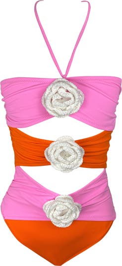 Gorgeous pink and orange color combination cutout one-piece,with handmade crochet white flowers.Definately must have classic for every season for the beach or the pool.
