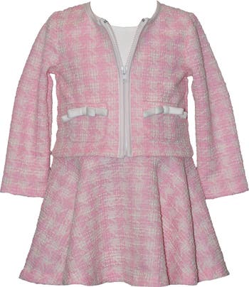 Contrast bows at the pockets add a fun flourish to a festive plaid-bouclé jacket that's paired with a mixed-media dress for a special-occasion–ready look.
