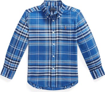 Soft cotton oxford cloth patterned in a colorful plaid makes a breathable, everyday favorite of a shirt that's sized for kids and topped with a classic buttoned collar. It looks great smooth, rumpled, tucked or untucked to match any child's sense of style.
