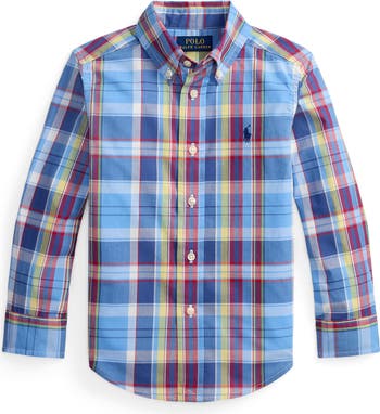 Crisp, cool cotton poplin patterned in a colorful plaid makes a special-occasion favorite of a shirt that's sized for kids and designed with a lower hem and a classic buttoned collar. It looks great smooth, rumpled, tucked or untucked to match any occasion and any child's sense of style.