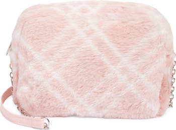 Little ones will love toting their essentials in this compact crossbody bag made of plush faux fur with a plaid pattern.