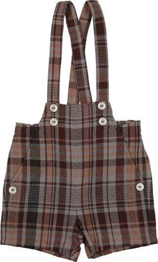 A warm-hued plaid looks adorable on shortalls designed with a classic look for your little one.