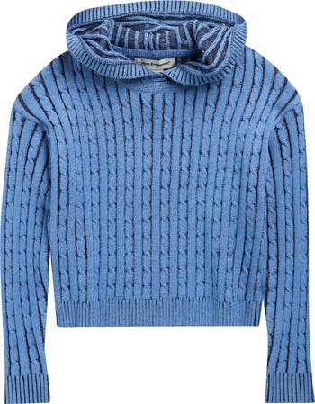 Two-tone plaiting brings contrast behind the cables on this cotton pullover sweater finished with a sporty hood.