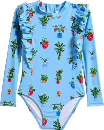 They'll love to splash and play in this one-piece swimsuit featuring frilly ruffles and long sleeves that block out the sun, sand and surf.