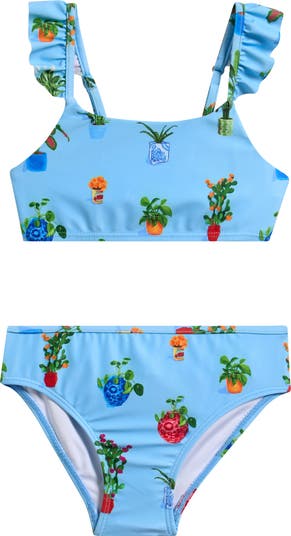 Bring a little retro flair to their pool days with this two-piece swimsuit splashed with a potted plant print and accented with frilly ruffles.