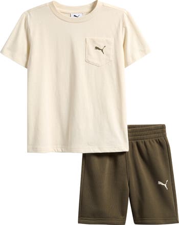 - T-shirt has chest patch pocket; shorts have elastic waist