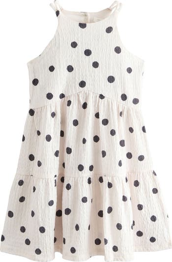 A tiered skirt and back cutout add to the charm of a summery dress patterned in sweet polka dots.