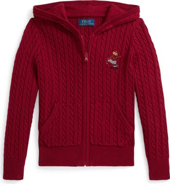 A skating Polo Bear emphasizes the cozy, easygoing comfort of this cable-knit hoodie made for little ones who like to relax in the comfort of soft cotton. Perfect for playtime, down time and every time in between, it makes a great addition to any active wardrobe.