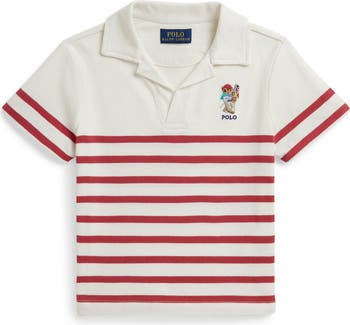 Nautical stripes and a seafaring Polo Bear make a colorful, adventure-ready splash on a polo made for kids who like the land-and-sea comfort of breathable cotton. An open collar completes the sporty look that travels well with any favorite outfit.