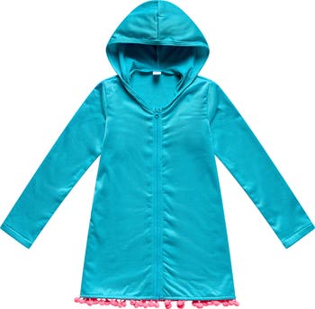 They'll love to lounge poolside wearing this cozy cover-up tunic featuring a fixed hood and playful poms along the hem.