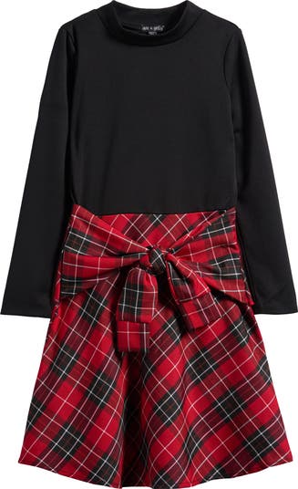 A plaid flared skirt and a contrasting bodice create a vintage-inspired dress with an adorable bow detail in the back.