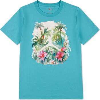 Tropical flowers and trees frame a negative-space Jumpman on a cotton-blend T-shirt pairing bright Jordan energy with a comfy kid size that's perfect for playing or relaxing.