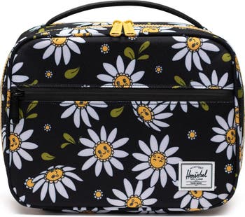 A waterproof zipper seals a front pocket for extra storage in this kid-size lunchbox featuring a whimsical daisy pattern and an insulated interior that easily wipes clean.