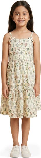 Darling bows and a unique floral print lend kid-approved charm to a tiered dress cut from crisp cotton poplin.