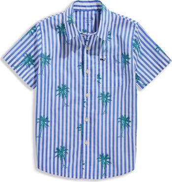 A tropical print adds to the laid-back vibe of this all-cotton button-up shirt.