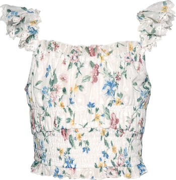 They'll love the soft frills and lovely lace on this flowery crop top made with sweet smocking.