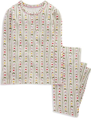 A henley neck and embroidered accents update snuggly long-sleeve pajamas made from soft cotton jersey and covered in a festive pattern.
