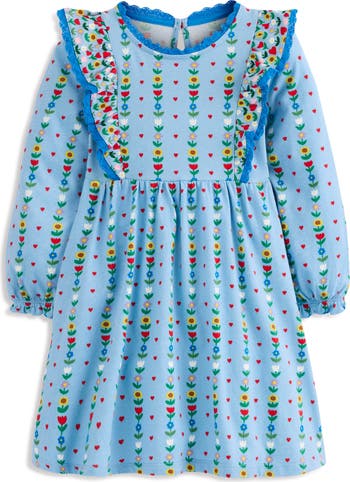 A vintage-inspired floral stripe, lace trim and frills make this cotton knit dress extra swishy in case dancing is on the agenda.