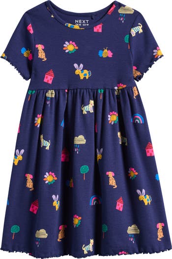 They'll stay comfortable playing or twirling in this stretchy cotton ribbed dress covered in a charming print and sweetened with lettuce-edge trim.