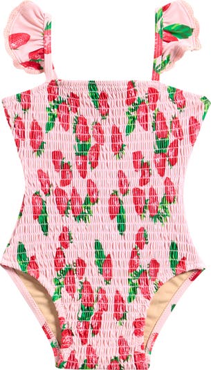 Smocking, ruffles and a strawberry print sweeten this one-piece swimsuit ready for some fun in the sun.