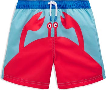 An oversized crab brings playful flair to these lightweight swim trunks topped by a drawstring waist to give your beachgoer a comfy fit.