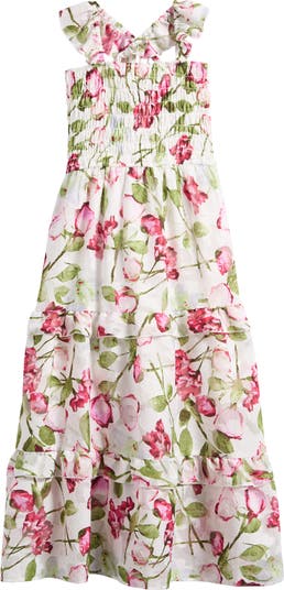 Frilly edges and vivid blooms distinguish a burnout-chiffon sundress made with a smocked bodice that offers your favorite youngster a perfect fit with every wear.