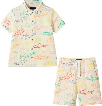 Your youngster will feel like they're ready for a vacation in this breezy cotton-gauze set featuring a button-up shirt and shorts made with a drawstring waist and handy pockets.