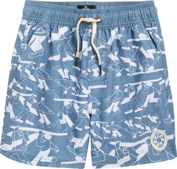 They'll love the surf-inspired print that brings a beachy look to these lightweight swim trunks.
