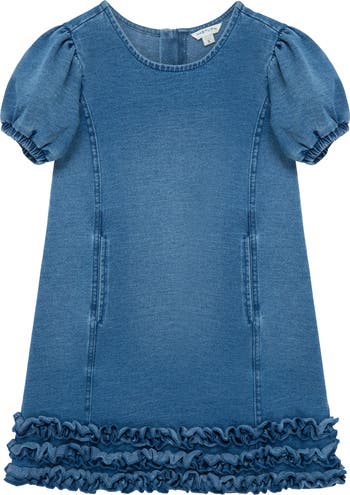 Ruffles ring the hem of a stretchy denim dress sized just for kiddos and framed with puff sleeves.