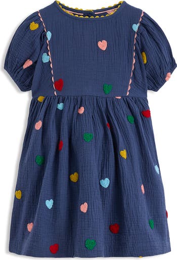 Let them dance and play in this comfy cotton-gauze dress framed by delightful puff sleeves and accented with fuzzy heart patches.