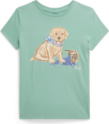 A pert pup spills fresh-picked blueberries in the whimsical image on this cotton-jersey T-shirt.