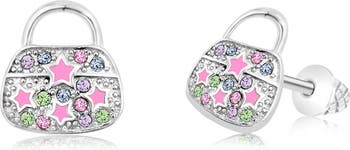 Bring eye-catching sparkle and color to your child's look with these purse-shaped stud earrings sparkling in colorful crystals.