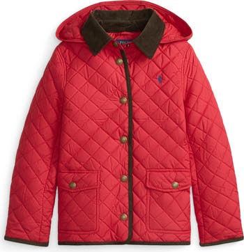A soft corduroy collar lends signature charm to a barn jacket textured in diamond quilting and topped by a roomy hood to combat the chill.