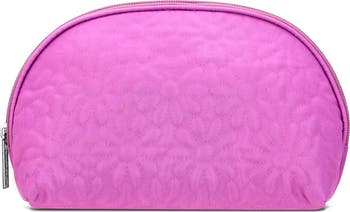 Delicate floral quilting adds volume and dimension to a whimsical kid-sized cosmetics bag perfect for storing their favorite trinkets while on the go.