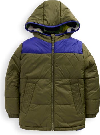 Your child will be prepared for cold, wet days in a waterproof reversible jacket that's quilted, insulated and topped with a hood lined with nubby fleece.