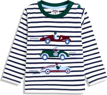 Race car appliqués and crisp stripes make this cotton-jersey T-shirt a playground-ready favorite.