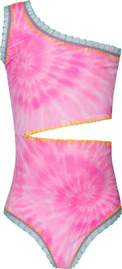 Rainbow embroidery trims a playful tie-dye swimsuit in a one-shoulder one-piece silhouette your child will love.