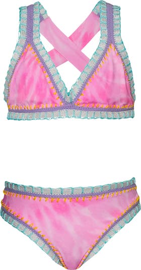 Colorful embroidery decorates a tie-dyed two-piece swimsuit, featuring a classic cross-back bikini top and hipster bottoms your child will love.