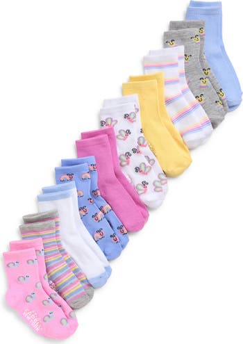 Keep tiny toes feeling cozy in these colorful crew socks made with nonslip gripper details at the bottom.