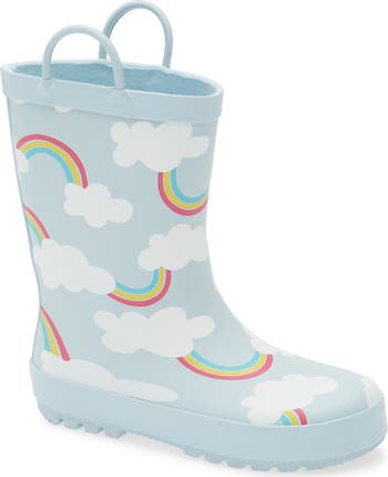 Wet and chilly days will be more fun with this rainbow-print rain boot in your little puddle jumper's collection.