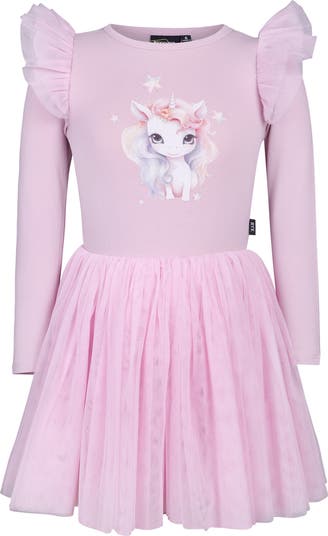 A frothy tulle skirt in pretty pastels lets your child twirl like a ballerina in this soft jersey dress dress complemented with ruffled shoulders and a free-spirited unicorn on the bodice.