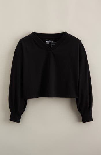 Inverted pleats on the sleeves add a fancy touch to a stretchy cotton-blend T-shirt that lets your child dash, dart and dream with a cool V-neck, a step hem for extra flair and sporty side slits.