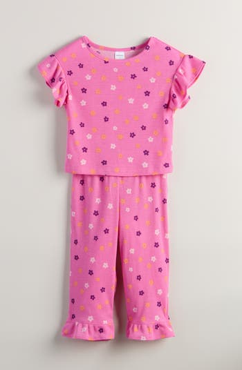 Pretty ruffles detail the sleeves and hems of these sleep-ready PJs made of a soft ribbed knit.